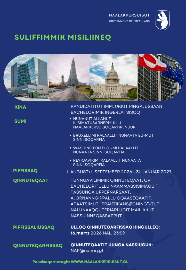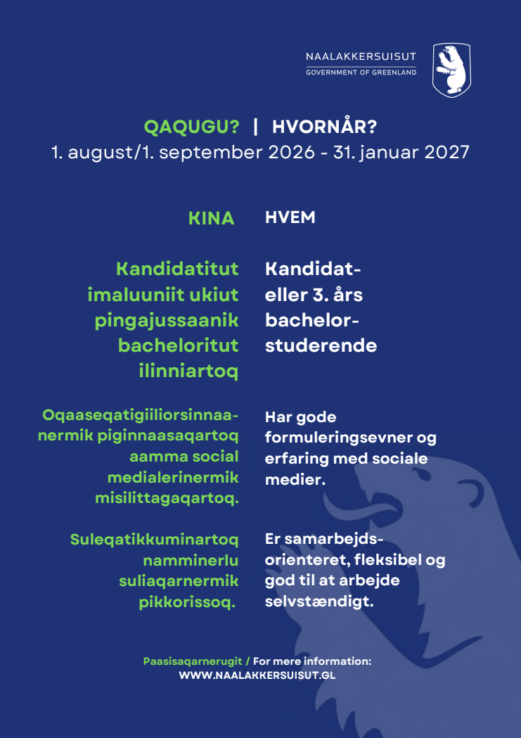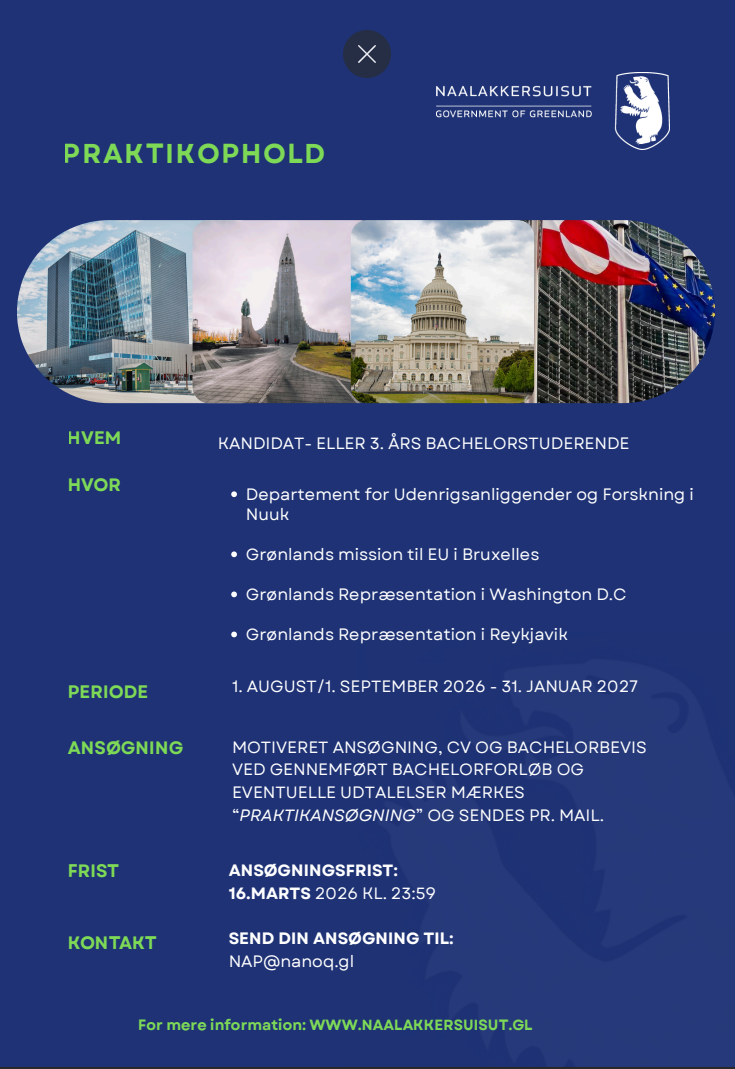 Vi opfordrer kandidatstuderende fra Rigsfællesskabet med interesse i politik, forsvar, Arktis, sundhed og Canada til at søge stillingen. Ansøgningsfristen er 10. marts 2026.