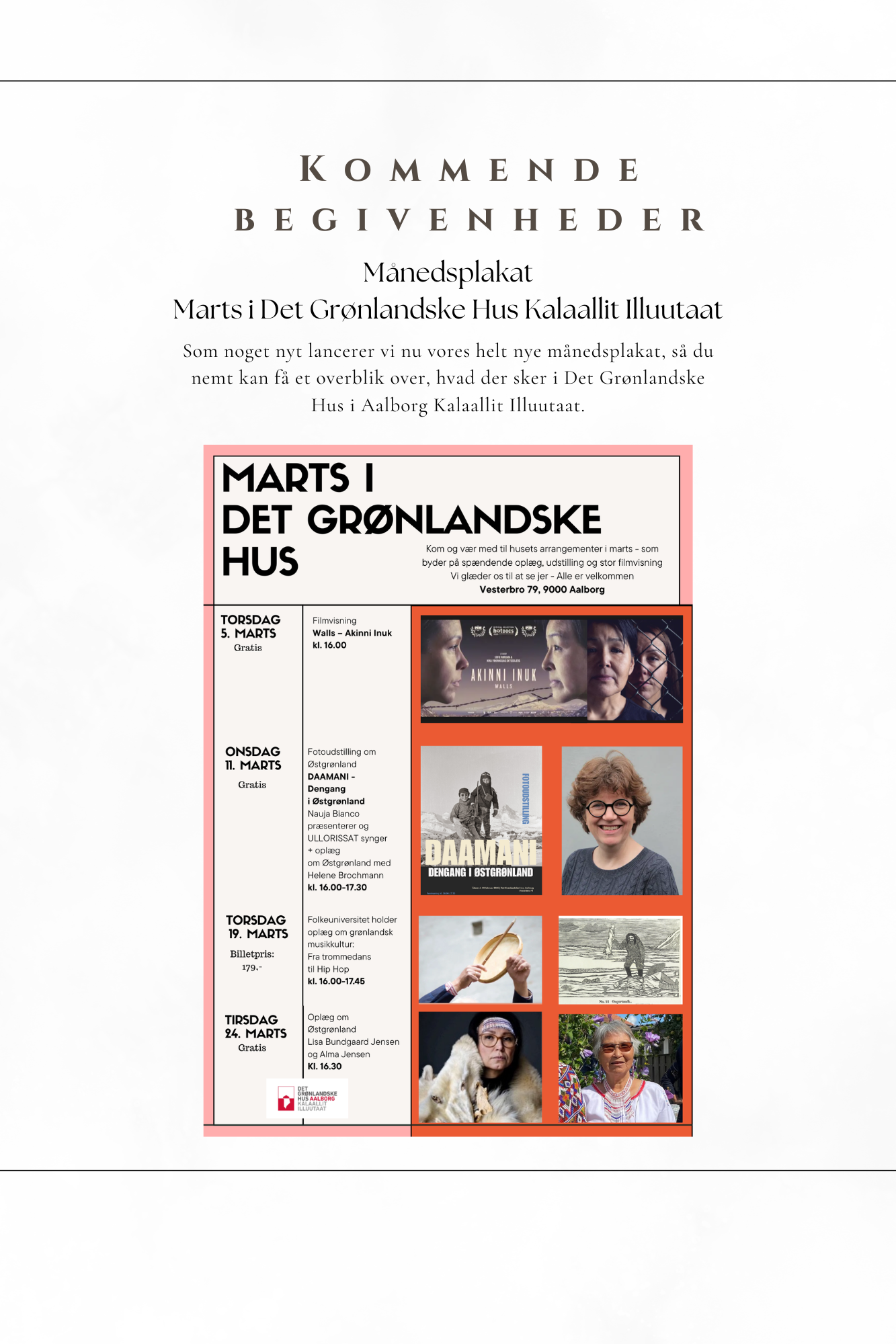 Følg med i, hvad der sker i Det Grønlandske Hus via vores nyhedsbrev, hvor du kan du læse om kommende arrangementer og få nyheder fra Huset.
